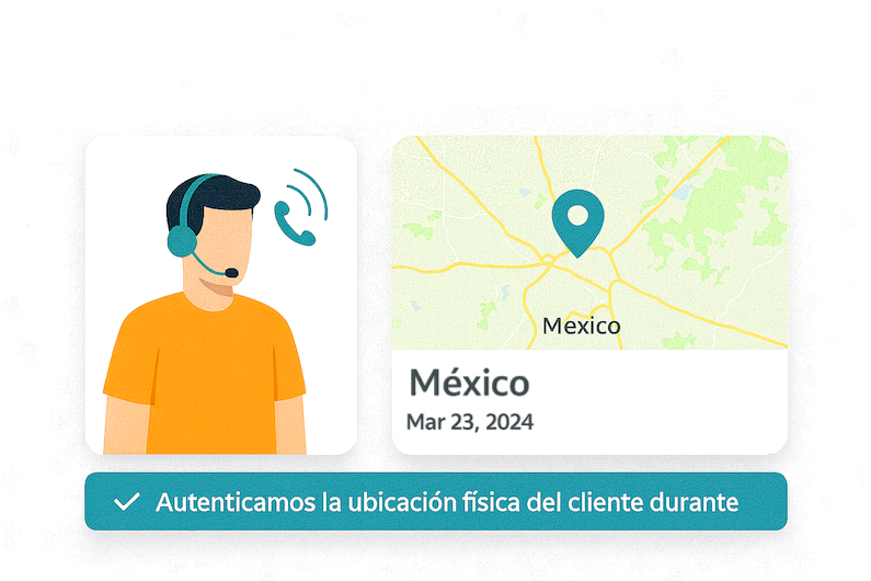 Autenticamos la ubicación física del cliente durante la llamada usando geolocalización con sello de tiempo y señales ambientales en pantalla, eliminando el costo y la demora de una visita presencial.